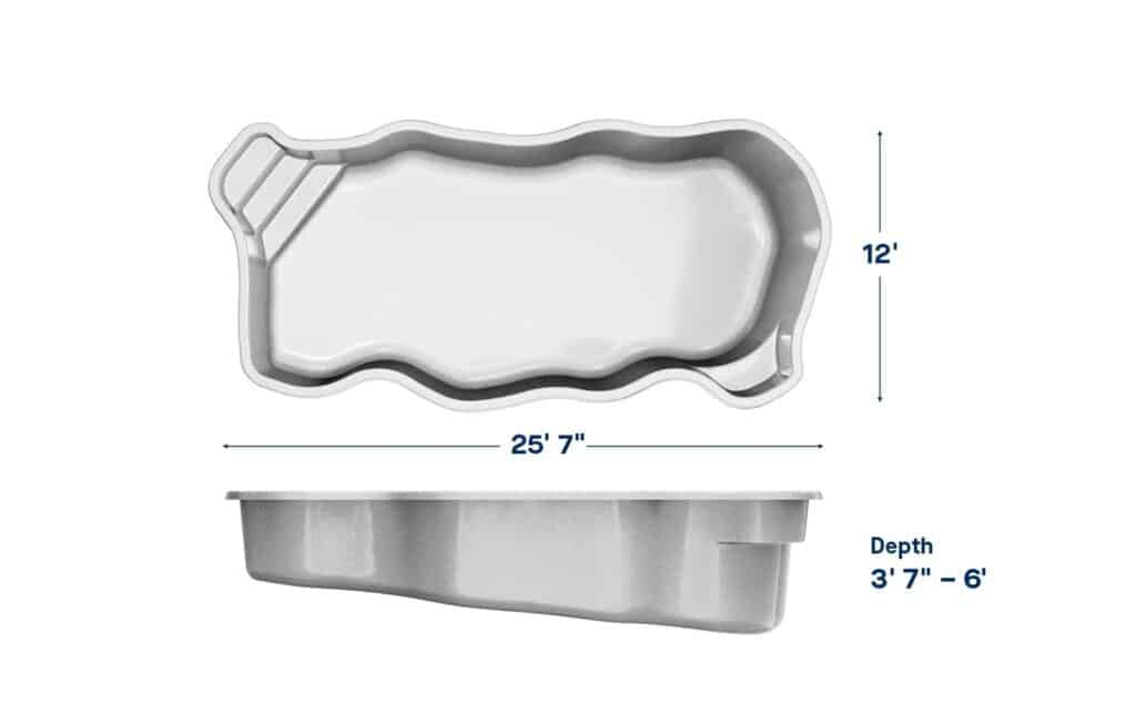 The Key West is a medium-sized freeform pool designed to fit comfortably in various backyard layouts. It measures approximately 12 feet wide by 25 feet 7 inches long. The depth features a gradual slope, starting at a shallow end of 3 feet 7 inches and reaching a maximum depth of 6 feet.