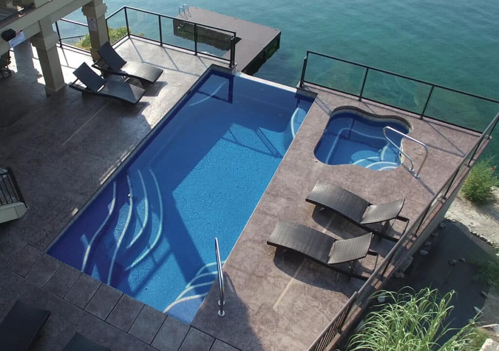 Like other Latham spa shells, the Regal can be finished with various colors (Crystite finishes) and paired with optional jets, bubblers, lighting, and spillover features when installed with a pool.